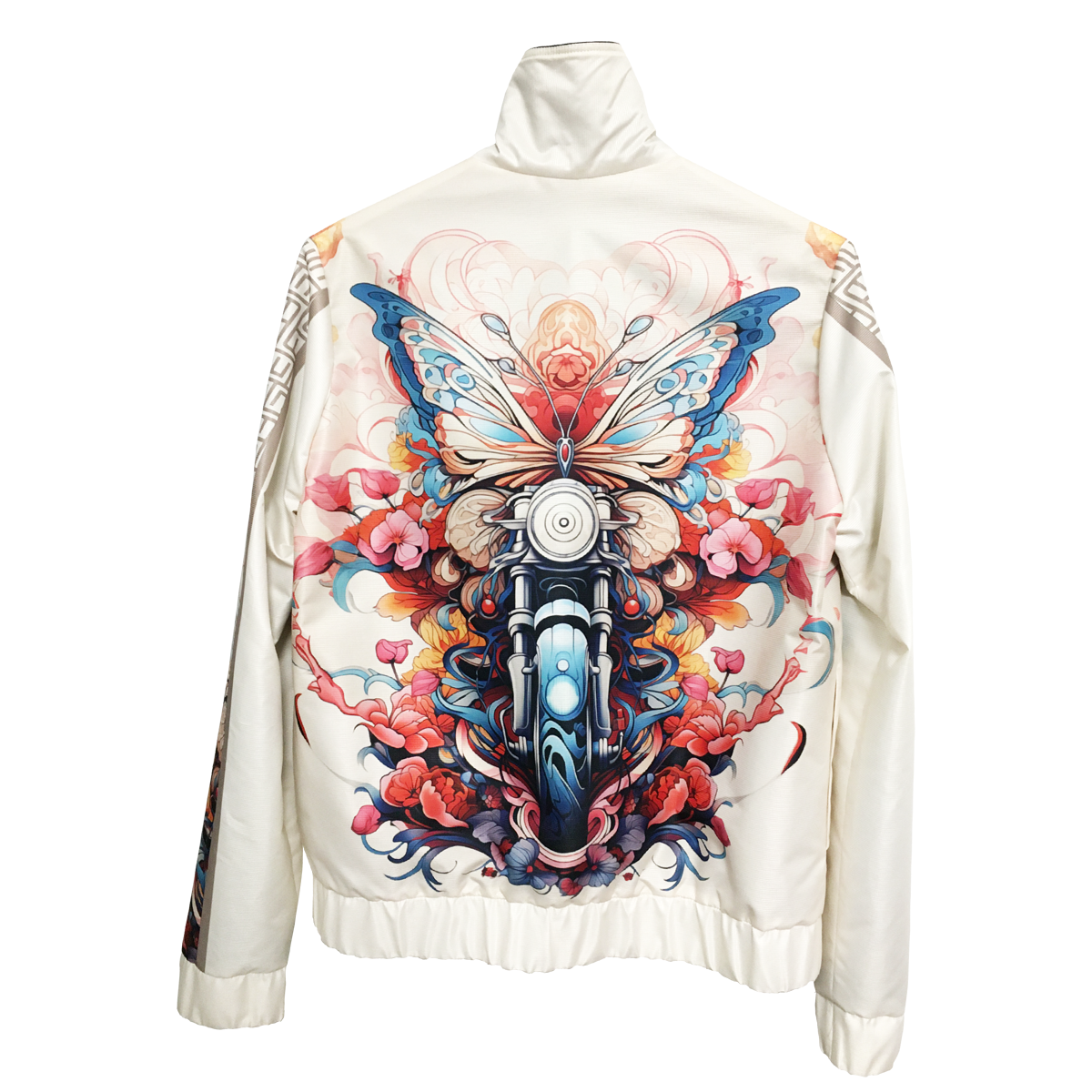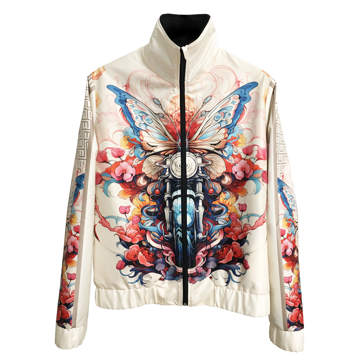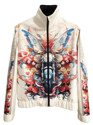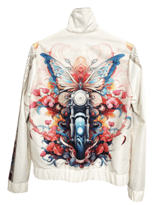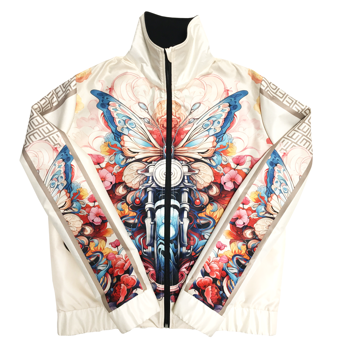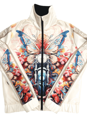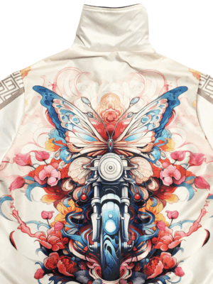 Stand out with this cool Wings of Ride jacket featuring a butterfly and motorcycle surrounded by dynamic abstract graphics. The neutral beige background highlights the brilliance of the pattern. The jacket is made of a pleasant, water-repellent material outside and lined inside, while the front zipper and pockets provide both style and functionality. It is an easy-to-wear piece yet extravagant and sporty at the same time. Unique and fashionable outerwear, which can be matched with a Wings of Ride long-sleeved top from the collection.