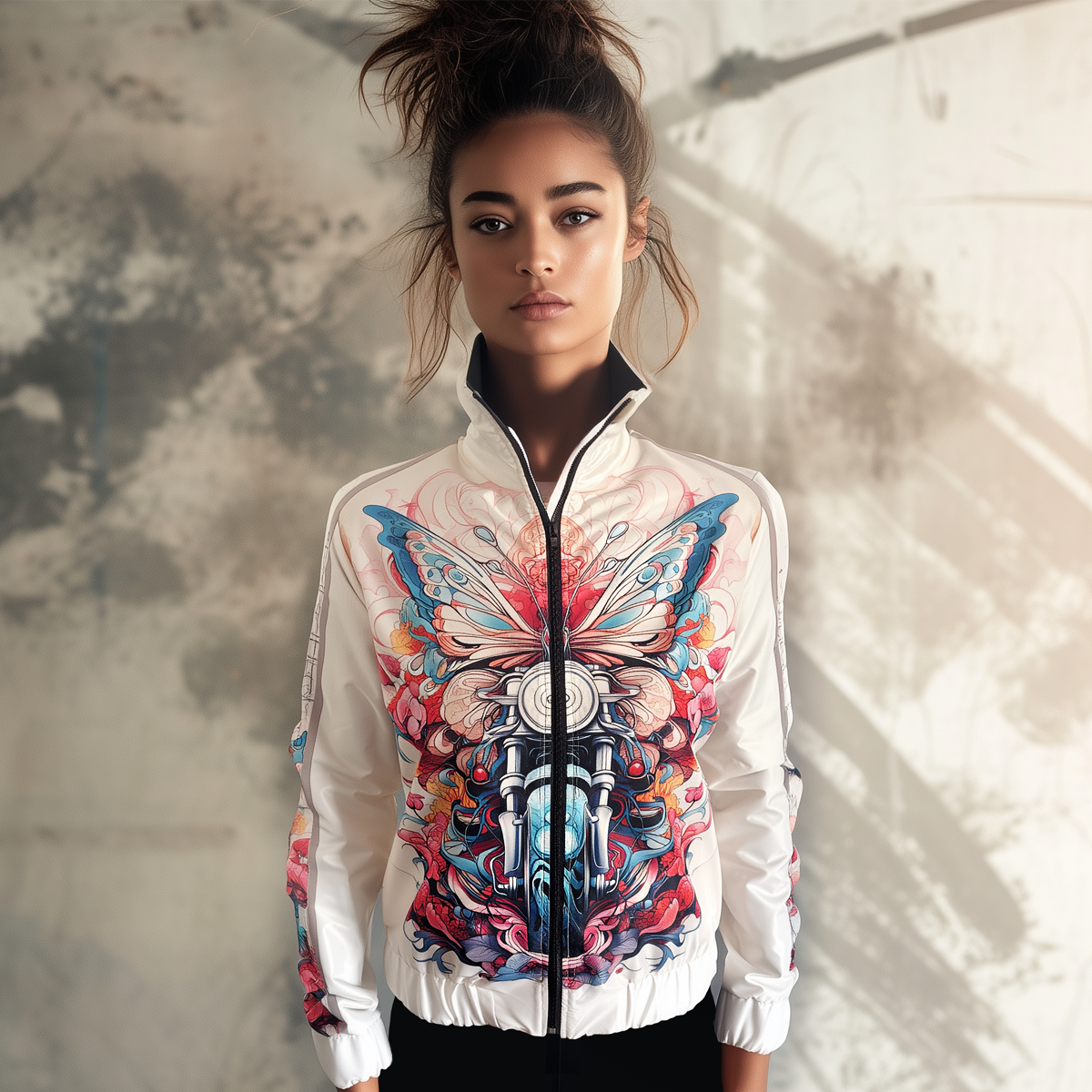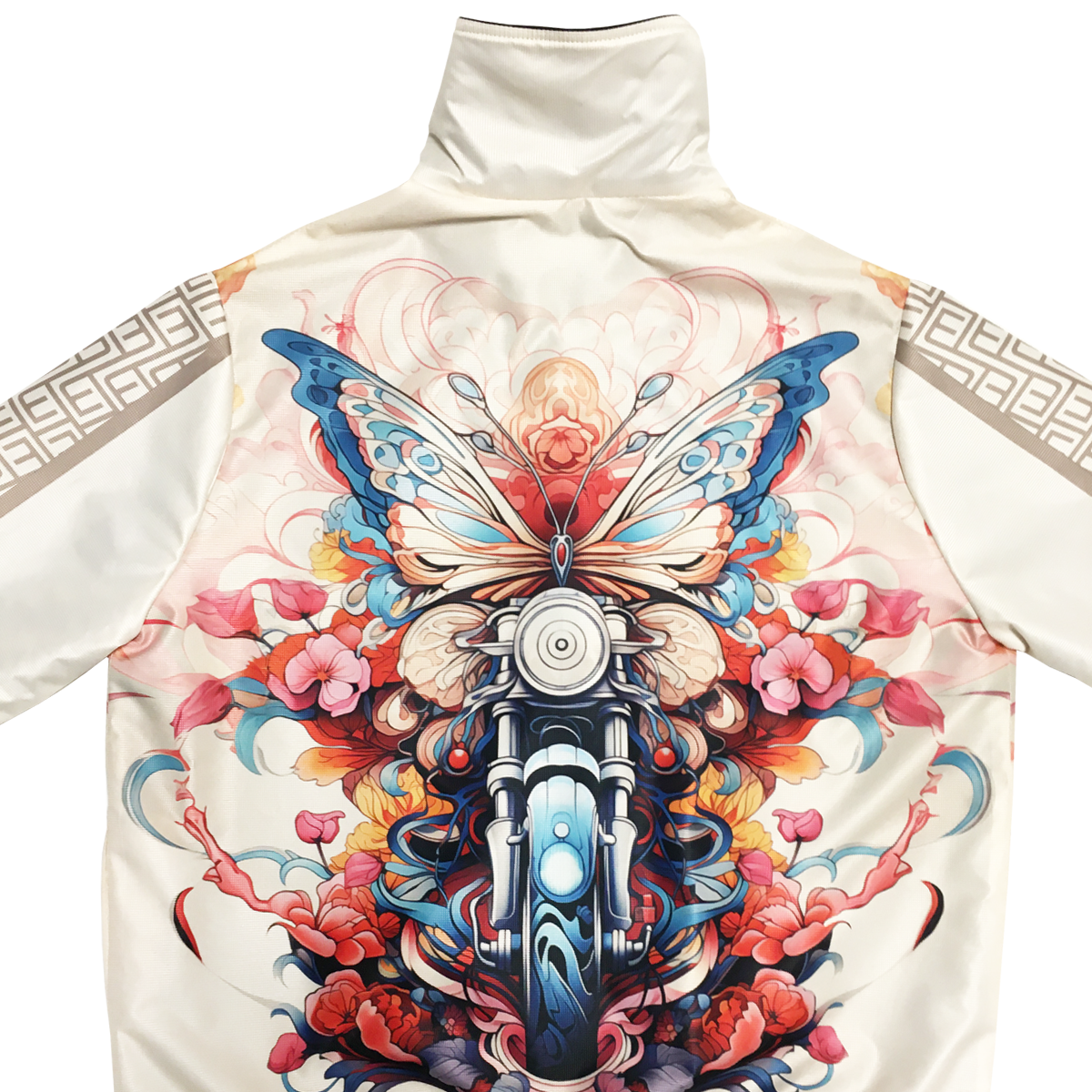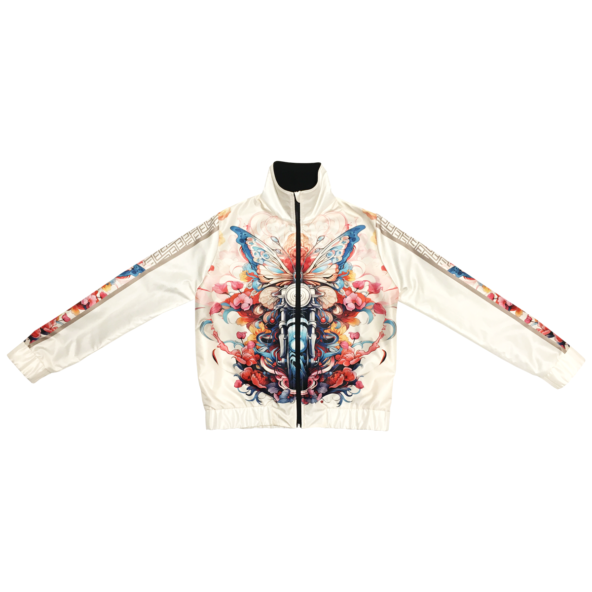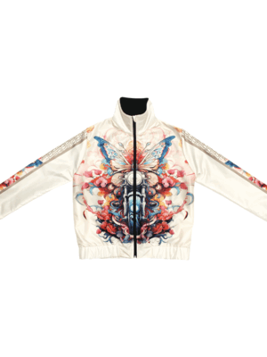 Stand out with this cool Wings of Ride jacket featuring a butterfly and motorcycle surrounded by dynamic abstract graphics. The neutral beige background highlights the brilliance of the pattern. The jacket is made of a pleasant, water-repellent material outside and lined inside, while the front zipper and pockets provide both style and functionality. It is an easy-to-wear piece yet extravagant and sporty at the same time. Unique and fashionable outerwear, which can be matched with a Wings of Ride long-sleeved top from the collection.